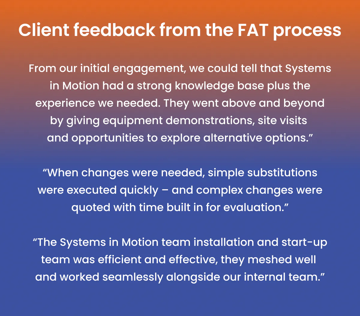 Because both the robotic palletizer and the MiR autonomous mobile robot technology were new iterations for the client, the team agreed early on that a FAT was essential. According to Project Manager Mark Alomia, the in-depth, week-long onsite FAT allowed everyone to test the system as close to real-world conditions as possible, but outside the pressures of the live production floor. The client brought engineering staff, QA, and safety personnel to participate, and Systems in Motion provided technology suppliers and experts. This 360-degree review created an open forum to ask questions, validate safety protocols, and fine-tune system logic before installation. The result? A more intuitive, controlled robotics process and a much smaller installation window once the system moved to the plant.